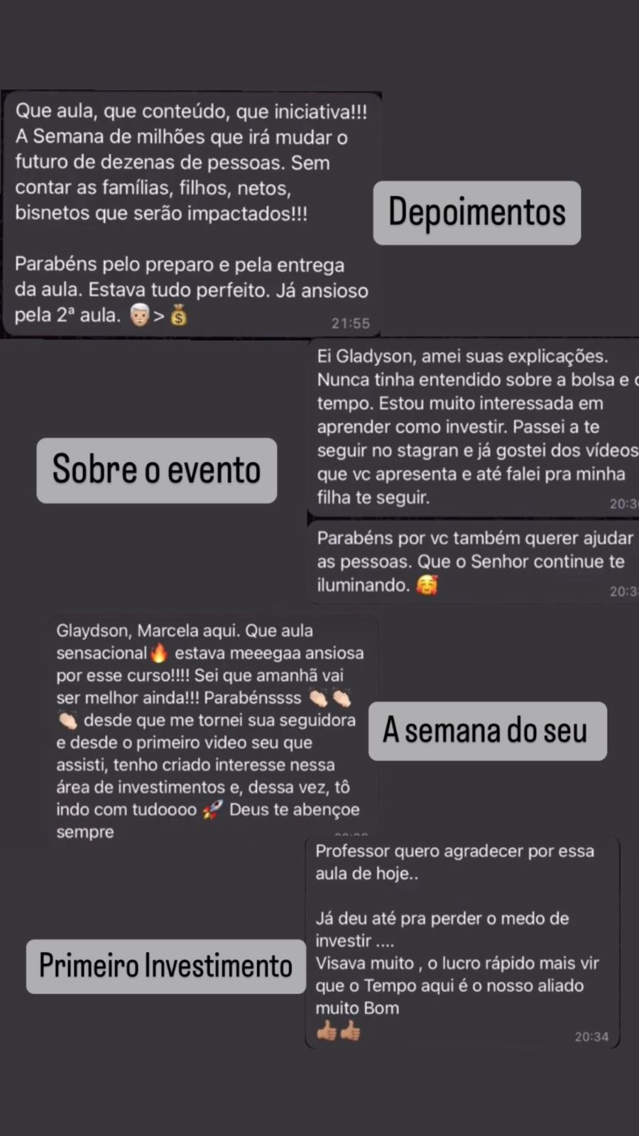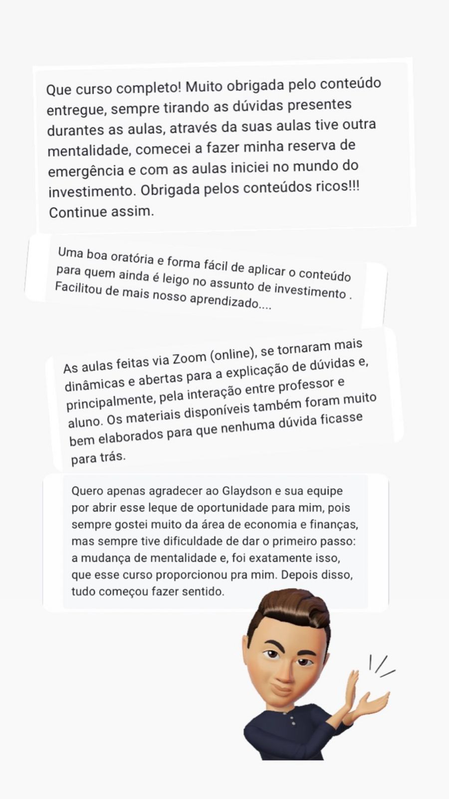 Meu nome é Glaydson Cerillo, sou palestrante, consultor financeiro e especialista em investimentos certificado pela Anbima. Aos 21 anos, fui aprovado em primeiro lugar no concurso público da Petrobras e, desde então, construí uma trajetória sólida de quase uma década na maior empresa do país, com destaque na área de Planejamento Financeiro de Contratos.